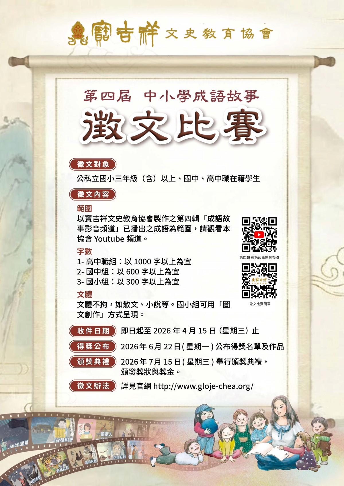 (一)得獎名單、作品預訂於2026年6月22日(星期一)個別通知,並公佈於本協會官網:http://www.gloje-chea.org/。